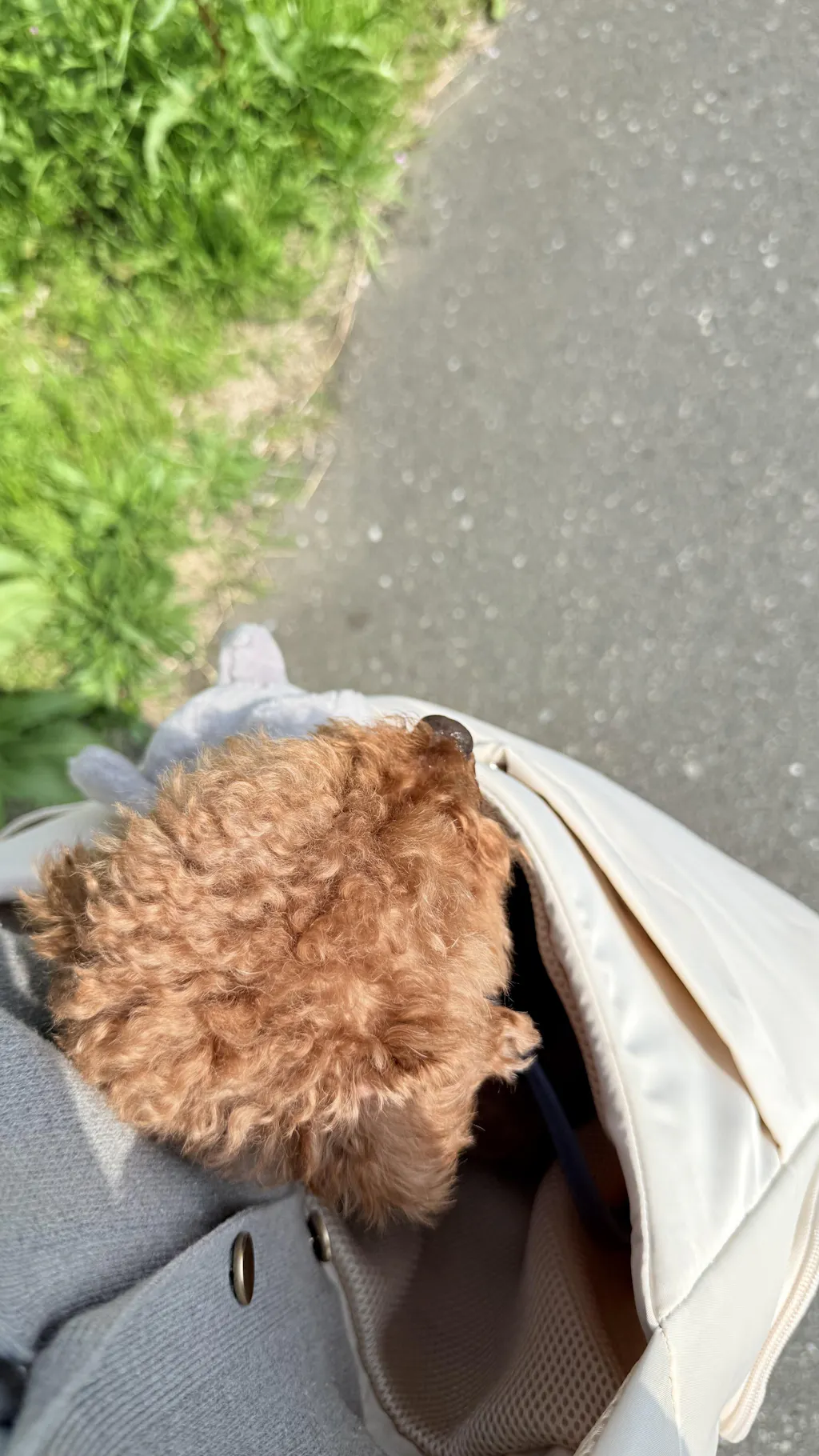 拡張メッシュは透けにくい素材を使っていて、バッグとも色味が近いから、わんちゃんの姿が目立ちにくく「少し大きめの普通のショルダーバッグ」のような見た目になります。
